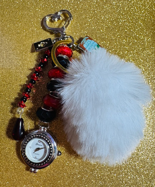 Add a playful touch to your style with our Alice Revisited Purse Charm/Keychain! Featuring a metallic red rose, red glass bead, and white faux fur pom pom charm, this 4.5 inch keychain embodies vintage charm with a modern twist. The battery-operated watch charm, glittery black and red murano beads, black spade, and Alice book charm add a whimsical touch. Complete with a heart clasp, this keychain is a must-have accessory for any Alice in Wonderland fan.