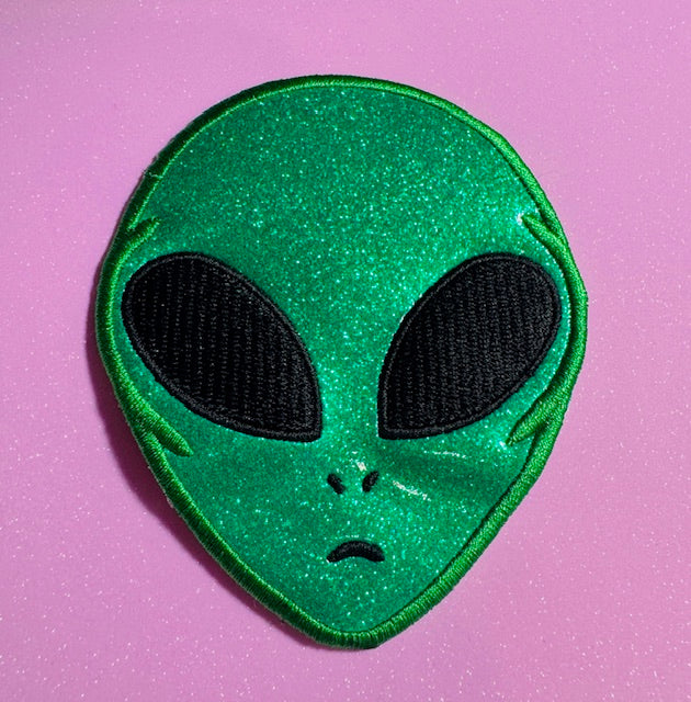 Get ready to step into the unknown with our Alien Patch! Made with green glitter embroidery vinyl, this 4 inch iron on patch will add a touch of sparkle to any outfit. It's truly out of this world!