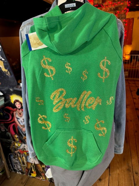 Get your pup looking fly in this Baller Green Hoodie Dog Shirt! With a soft, warm hoodie and eye-catching gold glitter design, your furry friend will be the coolest dog at the park. Available in a large size for bigger pups. Upgrade your dog's wardrobe game now! NWT