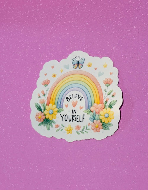 Boost your self-confidence with the Believe Rainbow Sticker. Made from water-resistant, glossy vinyl sticker paper, this 3-inch sticker features a playful rainbow design with the message "Believe in Yourself". Stick it anywhere to remind yourself to always have faith in your abilities!