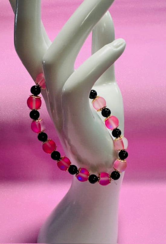 Upgrade your wrist game with our Blush and Noir Bracelet. The perfect combination of pink frosted glass beads, black pearls, and gold flower caps. Elastic and versatile at 7 inches, this bracelet adds a touch of playfulness to any outfit. Get ready to make a statement (without being too serious)!