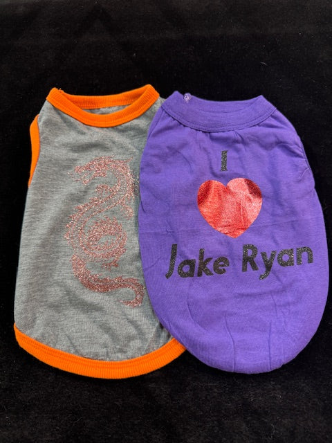 Dress your pup in personality with this adorable collection of small dog shirts! Each piece features a unique, eye-catching design. Choose from a cute purple shirt with a charming "I Heart Jake Ryan" message in red and black heat transfer vinyl, or go bold with a grey shirt accented by vibrant orange piping and a shimmery dragon design. These playful tees combine comfort with character—perfect for showing off your furry friend's fun side. Mix and match to keep their wardrobe fresh and fabulous!
