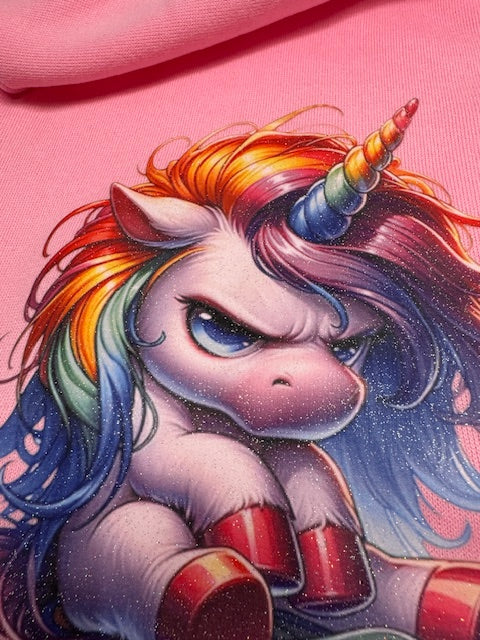 Your pup deserves a little attitude! This XL dog hoodie features a sassy grumpy unicorn in stunning rainbow colors with a glittery DTF design that catches the light beautifully. The soft pink fabric keeps your furry friend cozy while the bold, colorful unicorn graphic adds personality and charm. Perfect for dogs who have opinions—and the style to match. Watch heads turn on walks and playdates!