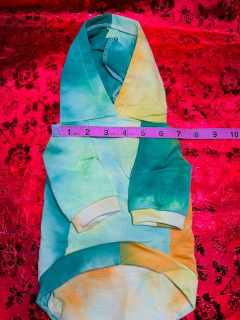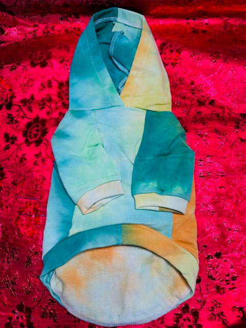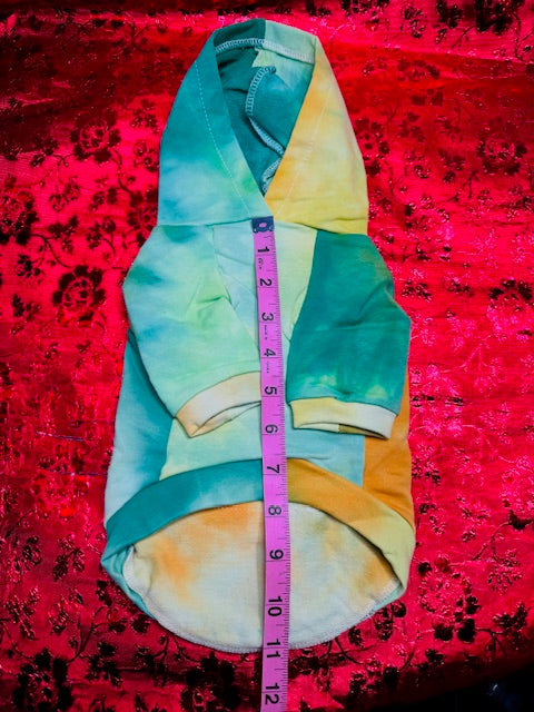 Peace and Love Santa Dog Shirt Large Spread holiday cheer with this adorable tie-dyed hoodie featuring a cute Santa striking the peace sign! Perfect for your furry friend, this cozy pullover combines festive vibes with groovy tie-dye colors. Though sized large, it's ideal for smaller pups who love making a statement. Soft, warm, and bursting with personality—your pup will be the coolest reindeer at the party. DTF design.