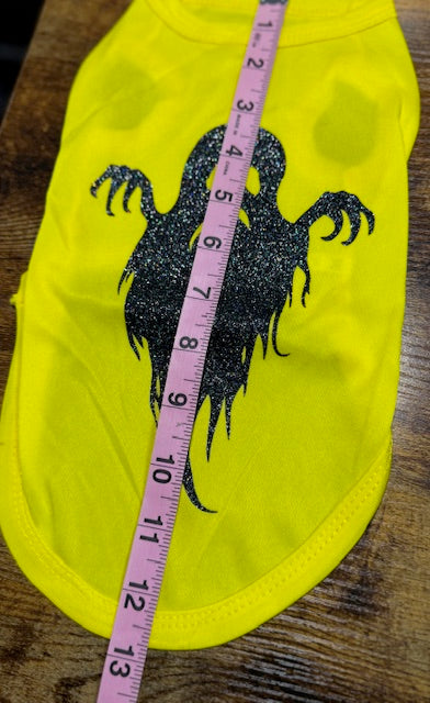 This playful pack of two medium dog shirts adds spooky fun to your pup’s wardrobe. One shirt is bright orange with a glittery skull wearing a top hat, while the other is sunny yellow featuring a shimmering ghost. Made from comfortable polyester, these festive shirts are perfect for Halloween celebrations or festive everyday wear. Very lightweight.