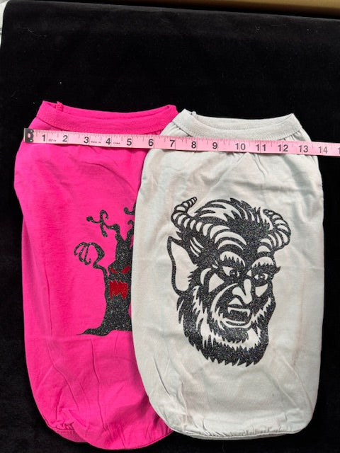 Transform your pup into a Halloween icon with this dynamic duo of large dog shirts! The hot pink tee showcases a spooky glittery tree crafted from eye-catching heat transfer vinyl, while the grey shirt features a menacing werewolf in shimmering detail. Whether your furry friend is howling at the moon or standing among enchanted trees, these playful pieces bring Halloween magic to life. Double the designs, double the festive fun!