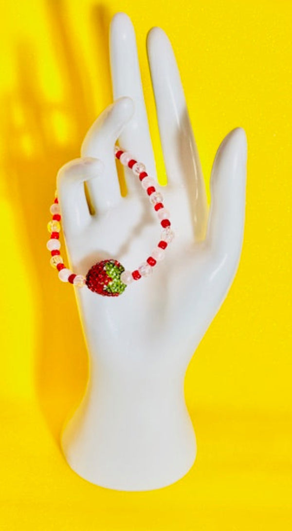 Add a fruity touch to your wrist with our Strawberry Bracelet! Adorned with a sparkling rhinestone strawberry and a mix of pink glass beads, red glass seed beads, and pink pearls, this 7 inch elastic bracelet is both cute and fun. Brace yourself for compliments!