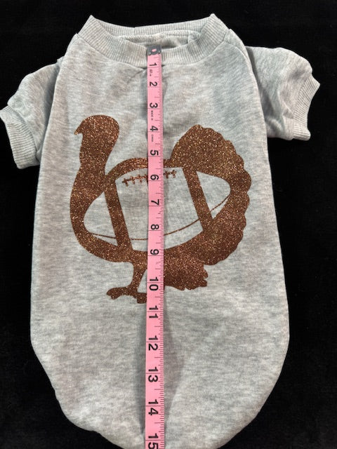 Get your pup ready to gobble up the holiday spirit in this festive Thanksgiving dog sweatshirt! Featuring a glittery brown turkey striking a football pose in eye-catching heat transfer vinyl, this X Large sweatshirt brings playful charm to turkey day celebrations. Perfect for dogs who want to join in on the fun, it's the ultimate way to dress up your furry friend for the season. Whether you're hosting a holiday gathering or just spreading autumn cheer, this sweatshirt makes a tail-wagging statement that'll have everyone smiling.