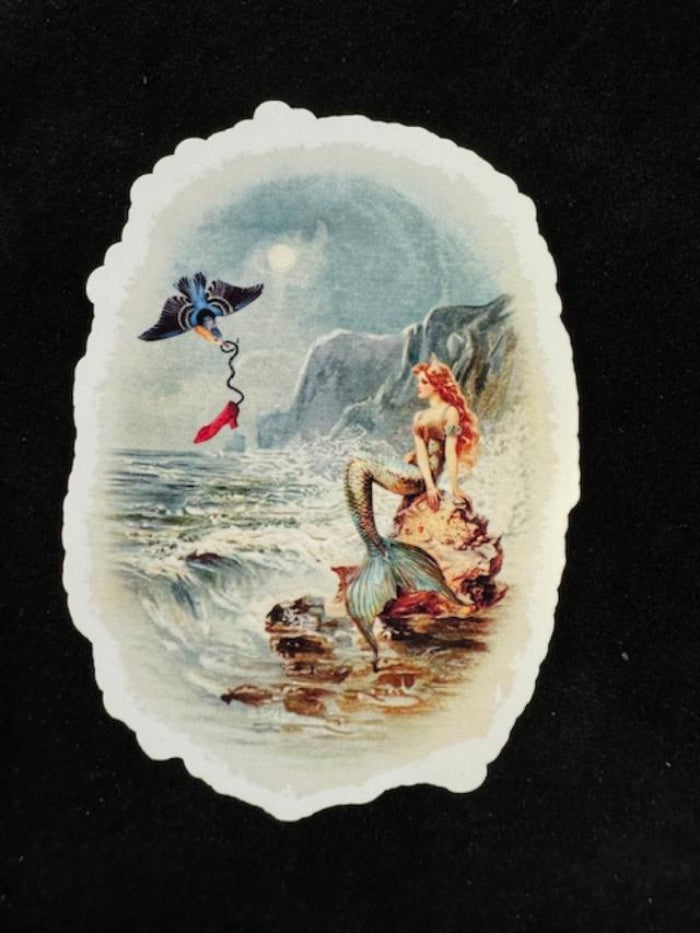 Mermaid sitting on the coast waiting for her friend to land and show the treasure he's found. This sticker is printed on a white glossy vinyl sticker paper that is water resistant. This sticker is 4 inches.